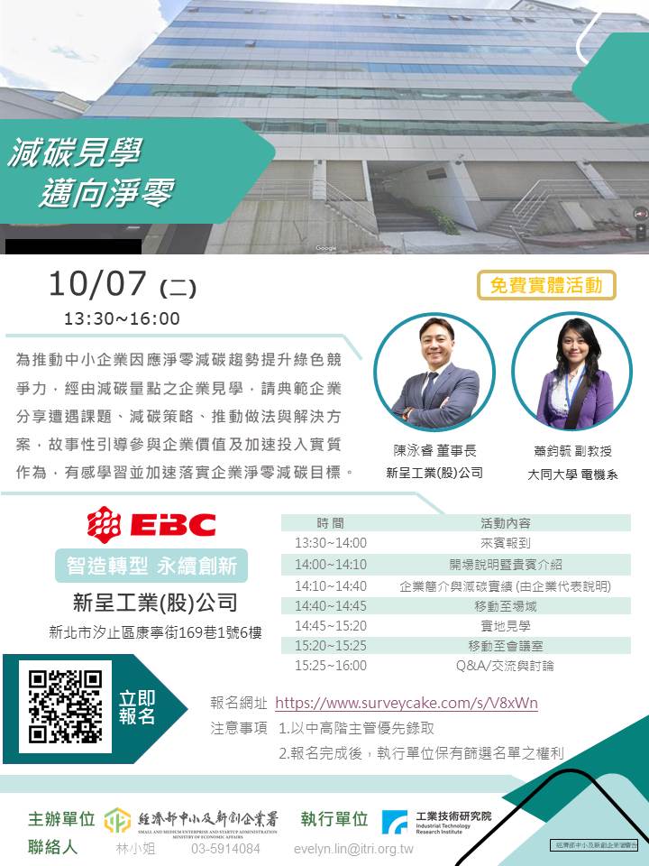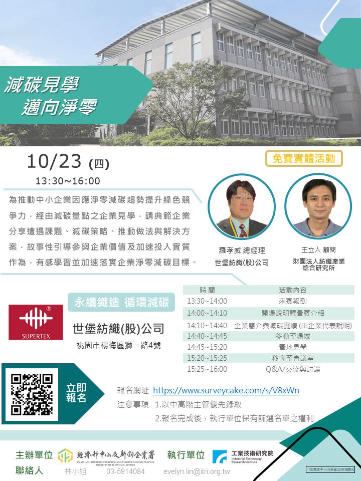 (轉知)工研院_10月7日(二)新呈工業、10月23日(四)世堡紡織-企業減碳見學活動開放報名中