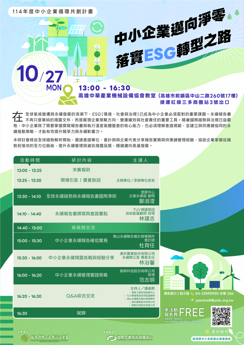 (轉發)塑膠中心免費活動_敬邀參加10月27日(一)「 中小企業邁向淨零落實ESG轉型之路研討會」