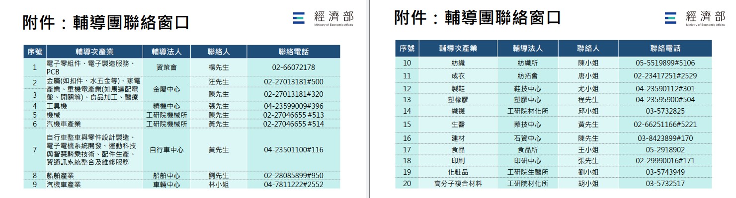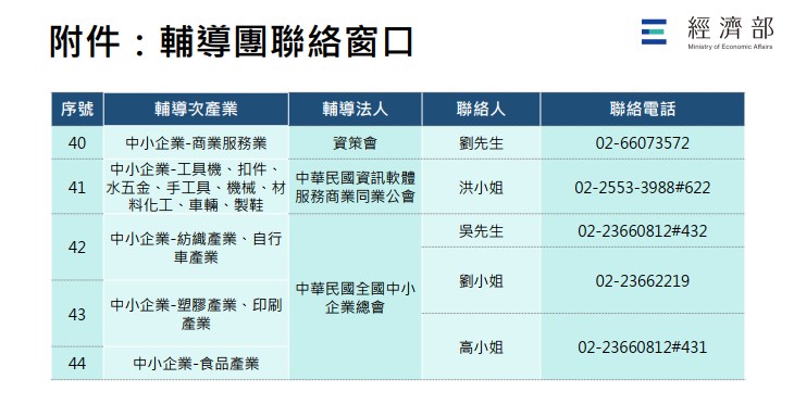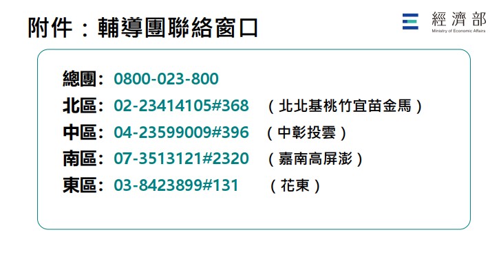 經濟部產業競爭力輔導團針對-AI數位轉型、AI人才培訓、金融支持、市場拓展、技術輔導、ESCO節能、勞動力升級有工研院專家輔導,資訊如下,歡迎就近尋求相關法人單位協助輔導