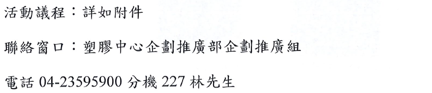 活動地點:台中塑膠中心 研發大樓202會議室(台中市西屯區工業區38路193號)